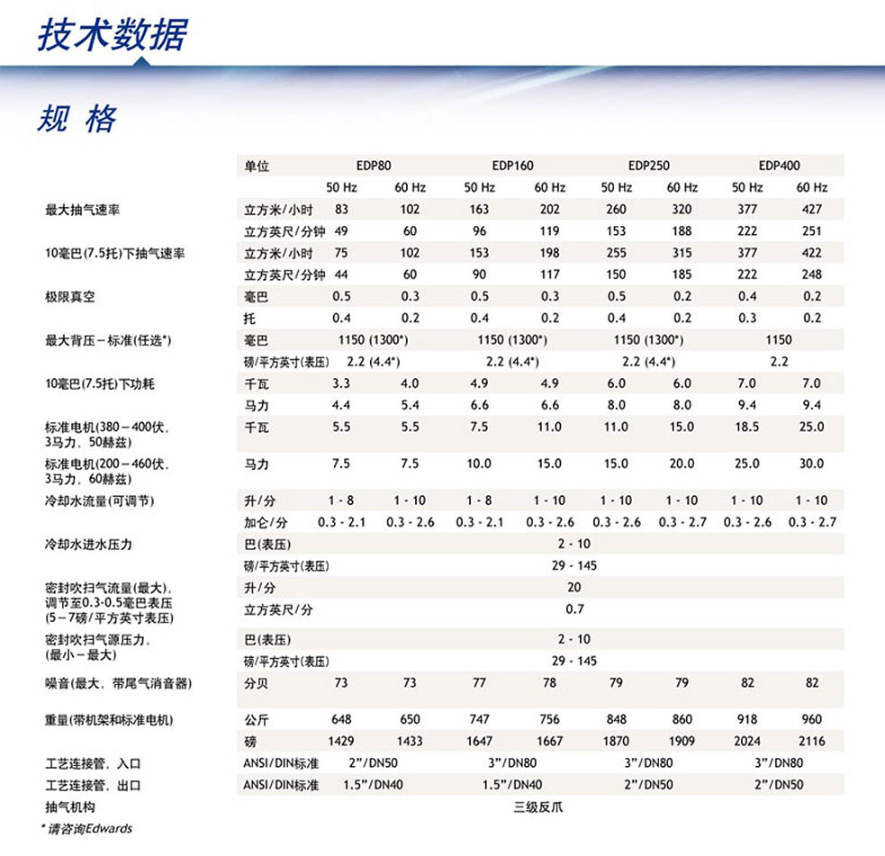 EDP 泵基于 Edwards 备受赞誉的无油、非接触式 反向爪式机构。该产品能够以低拥有成本高效 提供稳定的真空环境,符合最高安全 和性能标准。我们提供 4 种容量为 80-400 m3h-1、极限真空低于 1 mbar 的真空泵。